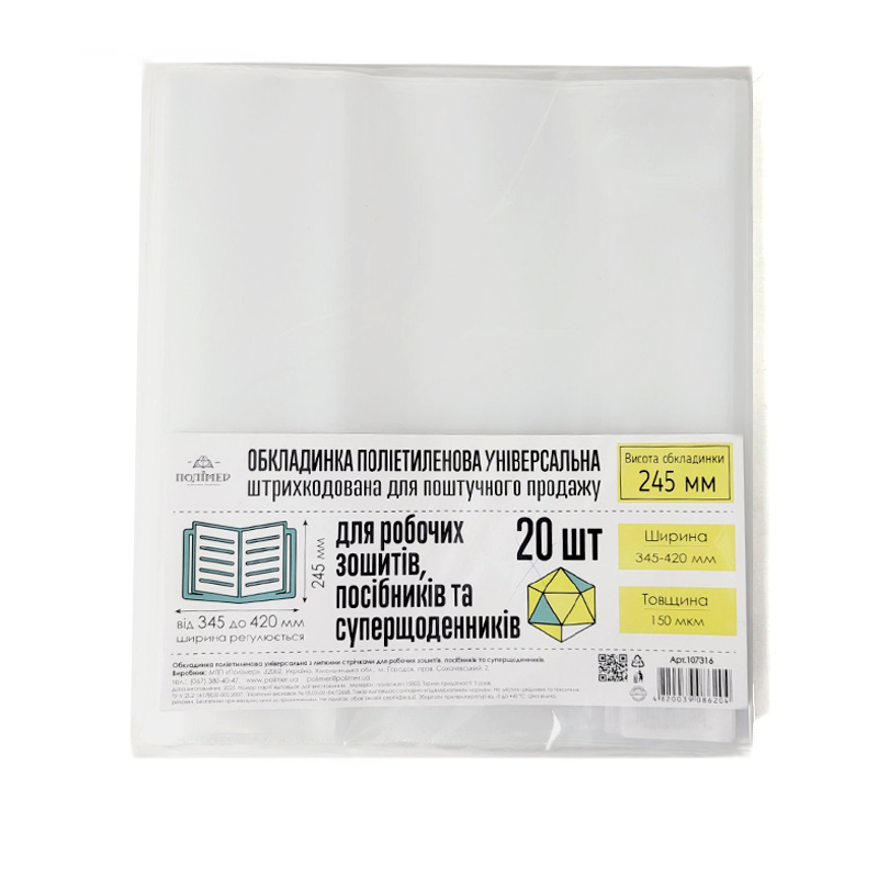 Обкладинки для роб зошитів та посіб, регул, п/е, по 20шт, 150мк, 240*410мм, h-240, арт.107315
