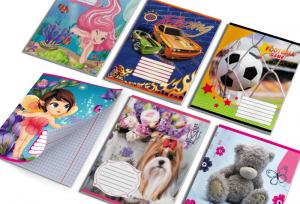 Тетрадь ученическая, в косую линию. Собственного производства. Обложка: картонная с цветными рисунками в ассортименте. Количество листов: 12. Формат: А5. Тип скрепления: скоба. Тип бумаги: офсетная.